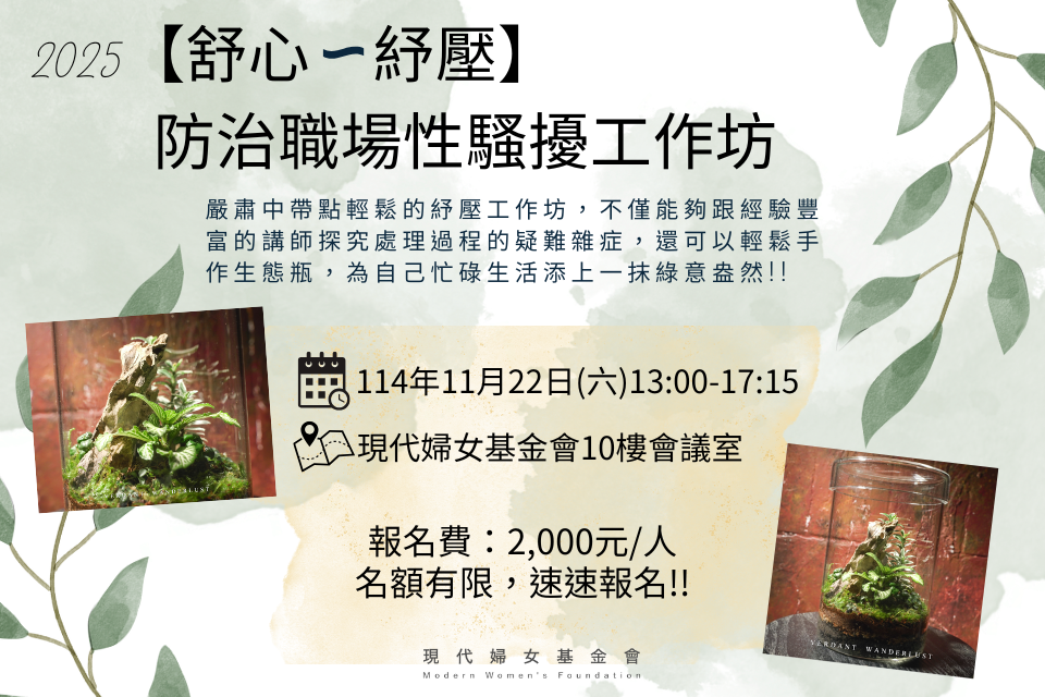 從實務中看見需求是現代婦女基金會秉持的重要信念,為協助處理性騷擾事件之受理人員、調查人員,自109年正式推出防治職場性騷擾工作坊,並不斷地思考如何能夠更貼近夥伴們的需求。今年特別嘗試推出嚴肅中帶點輕鬆的紓壓工作坊,不僅能夠跟經驗豐富的講師探究處理過程的疑難雜症,還可以輕鬆手作生態瓶,為自己忙碌生活添上一抹綠意盎然。心動就快行動~~