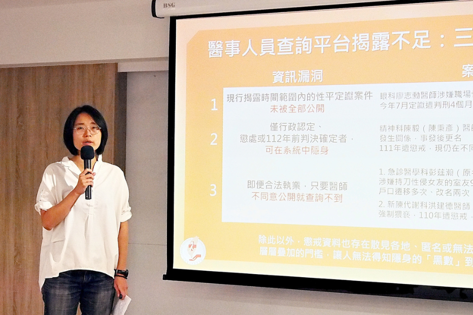 台灣醫療改革基金會執行長林雅惠指出,現行系統存在三大漏洞,首先是前述期間內的判決定讞案件未被全部公開;其次是僅行政認定、懲處或112年前遭判決確定者不在公告範圍內;第三,目前合法執業的醫師,只要不同意公開就無法查詢相關資訊。除此以外,懲戒資料也存在散見各地、匿名或無法追溯的情況,這些層層堆疊的查詢門檻,讓人無法得知還有多少「黑數」,仍安逸躲在政府與醫界共築的保護傘,隱身執業。只要有一件沒有被揭露,就代表還有民眾與基層醫事人員會在不知情中承擔風險。