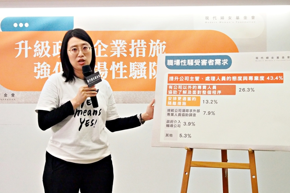 調查指出,填答者中有32.8%曾遇職場性騷擾,其中86.8%為女性。遭受職場性騷擾的受訪者中,有四分之一的人認為公司的因應態度消極,而實際向公司反映或申訴者僅佔四成,且其中逾半數(54.8%)認為公司未妥善處理,包含調查程序有瑕疵、主管職態度消極甚至包庇行為人、處理人員專業度不夠,甚至忽略受害人需求等。黃傳馨發現,企業雖做到基本防治措施,然當實際發生性騷擾時,處理能力卻相當不足,消極作為恐對受害人造成二度傷害。對此,43.4%曾遭性騷擾的受訪者,希望能提升公司主管及處理人員專業度,26.3%則希望能有公司以外的專責人員協助面對整個程序。