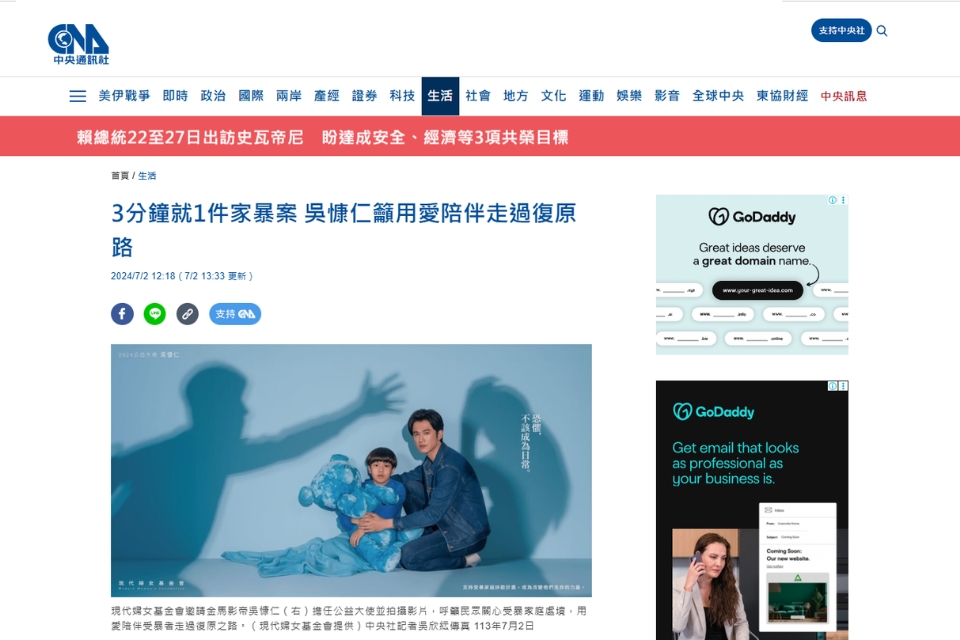 中央社_3分鐘就1件家暴案 吳慷仁籲用愛陪伴走過復原路