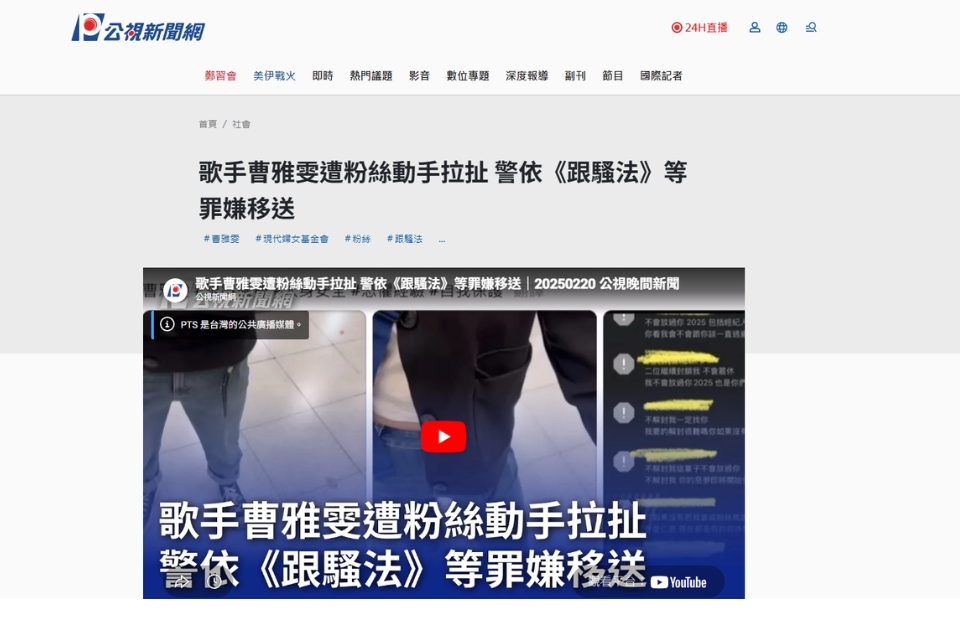 公視新聞網_ 歌手曹雅雯遭粉絲動手拉扯 警依《跟騷法》等罪嫌移送