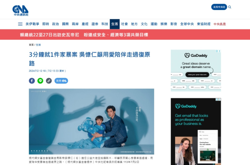 中央社_3分鐘就1件家暴案 吳慷仁籲用愛陪伴走過復原路