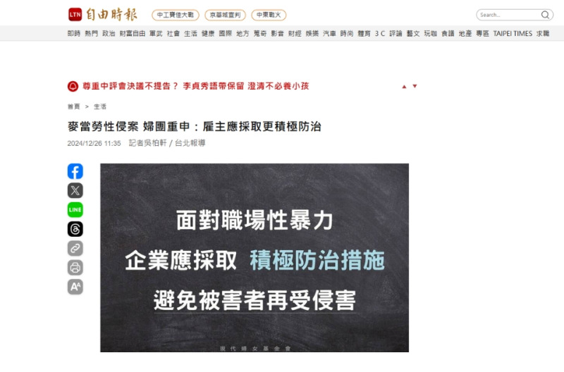自由時報 _ 麥當勞性侵案 現代婦女基金會重申:雇主應採取更積極防治