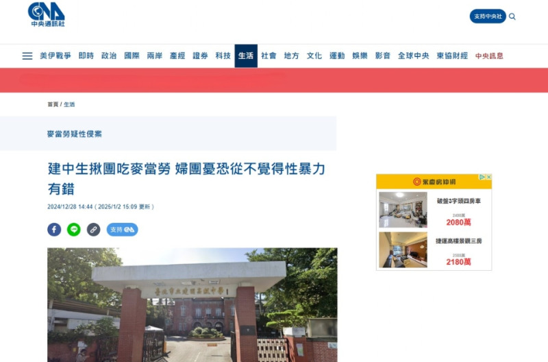 中央社_建中生揪團吃麥當勞 婦團憂恐從不覺得性暴力有錯